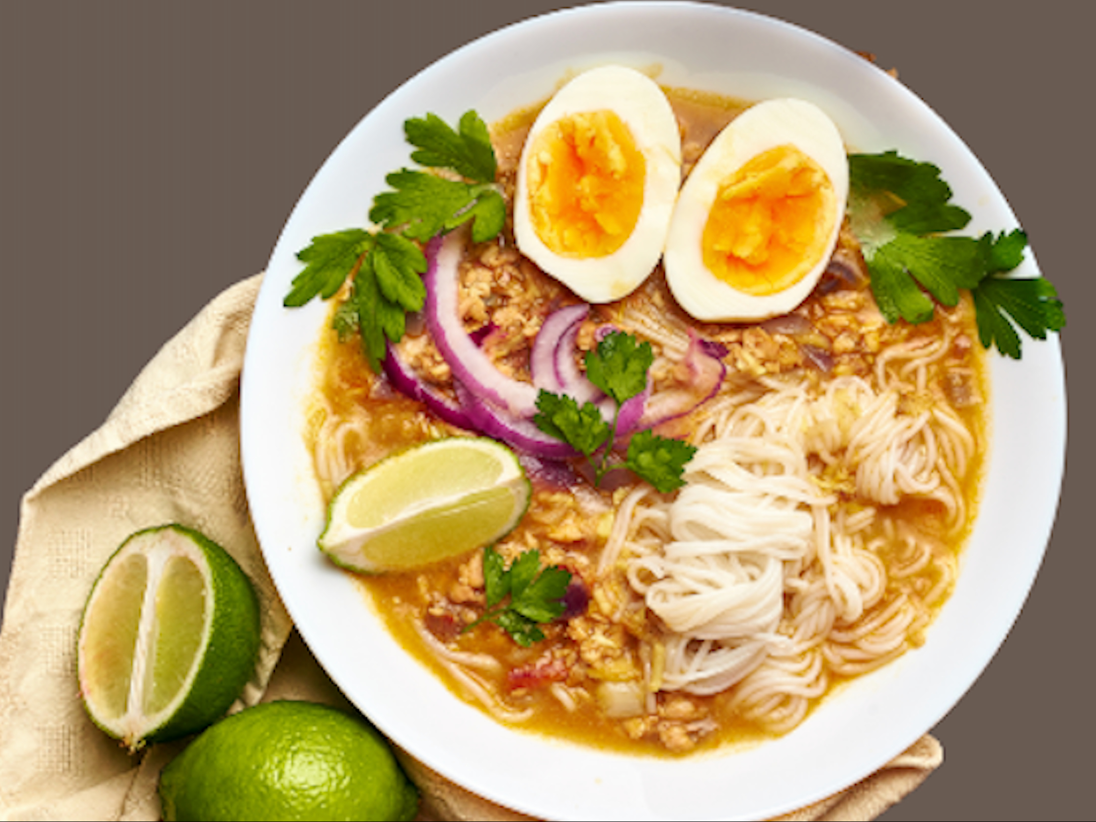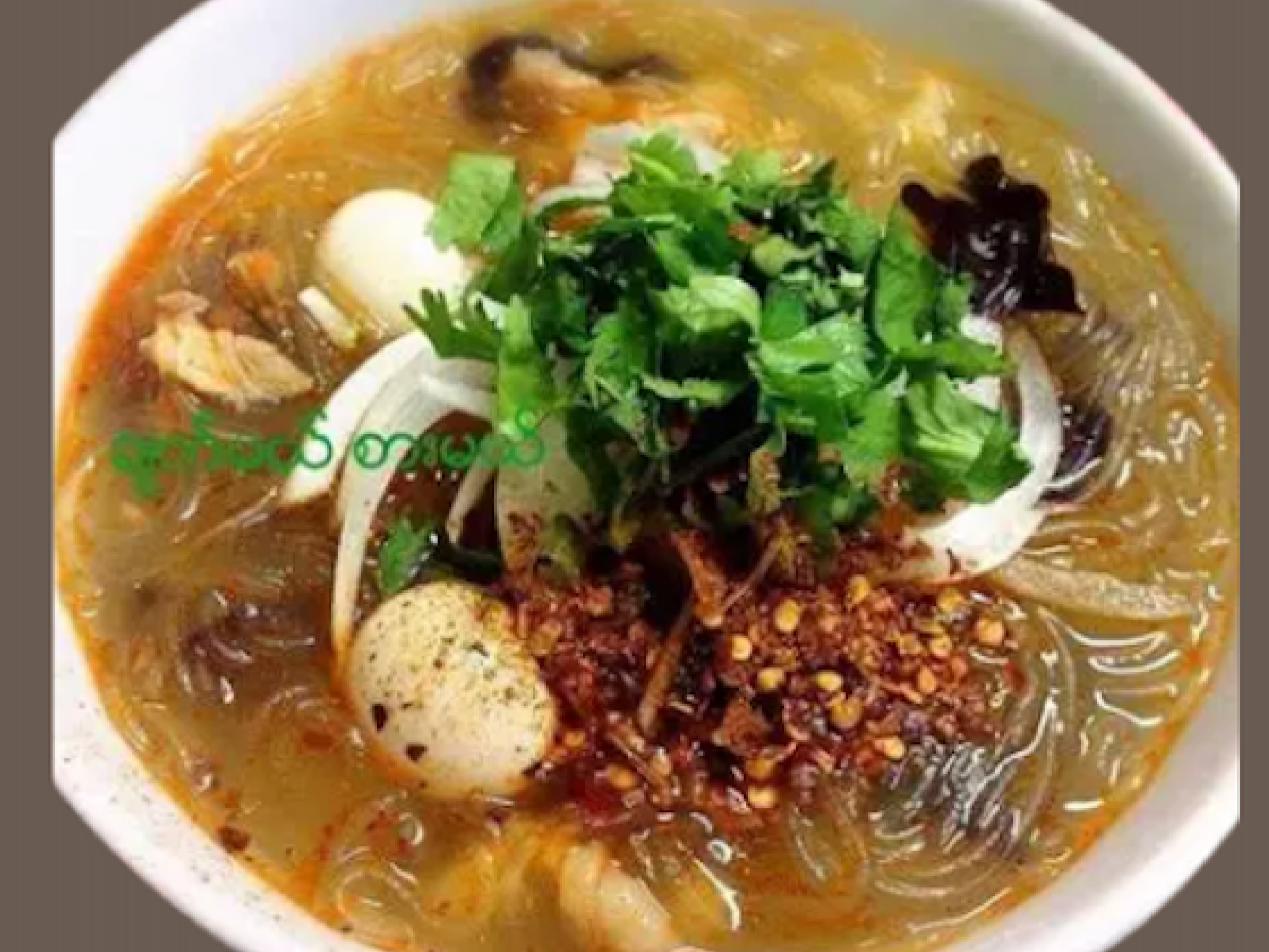 Tofu, Turmeic, Roasted Cickpeas Powder, Peanut Powder, Onion, Garlic Oil, Lime Leaf, Special Sauce, Green Chilli, Chili Flakes, Csbbage, Fried Garlic, Fish Sauce, Chicken Powder,lime Juice