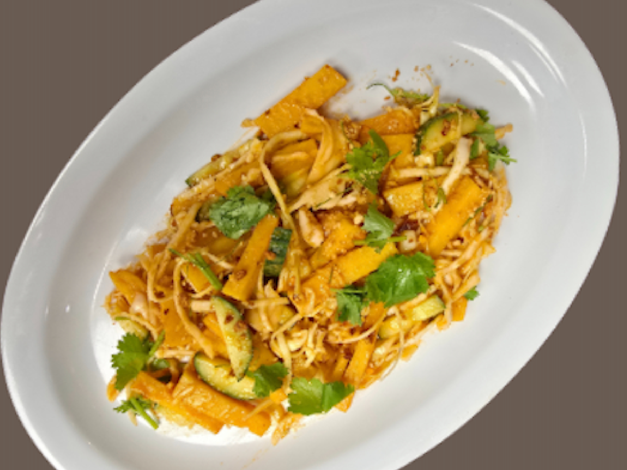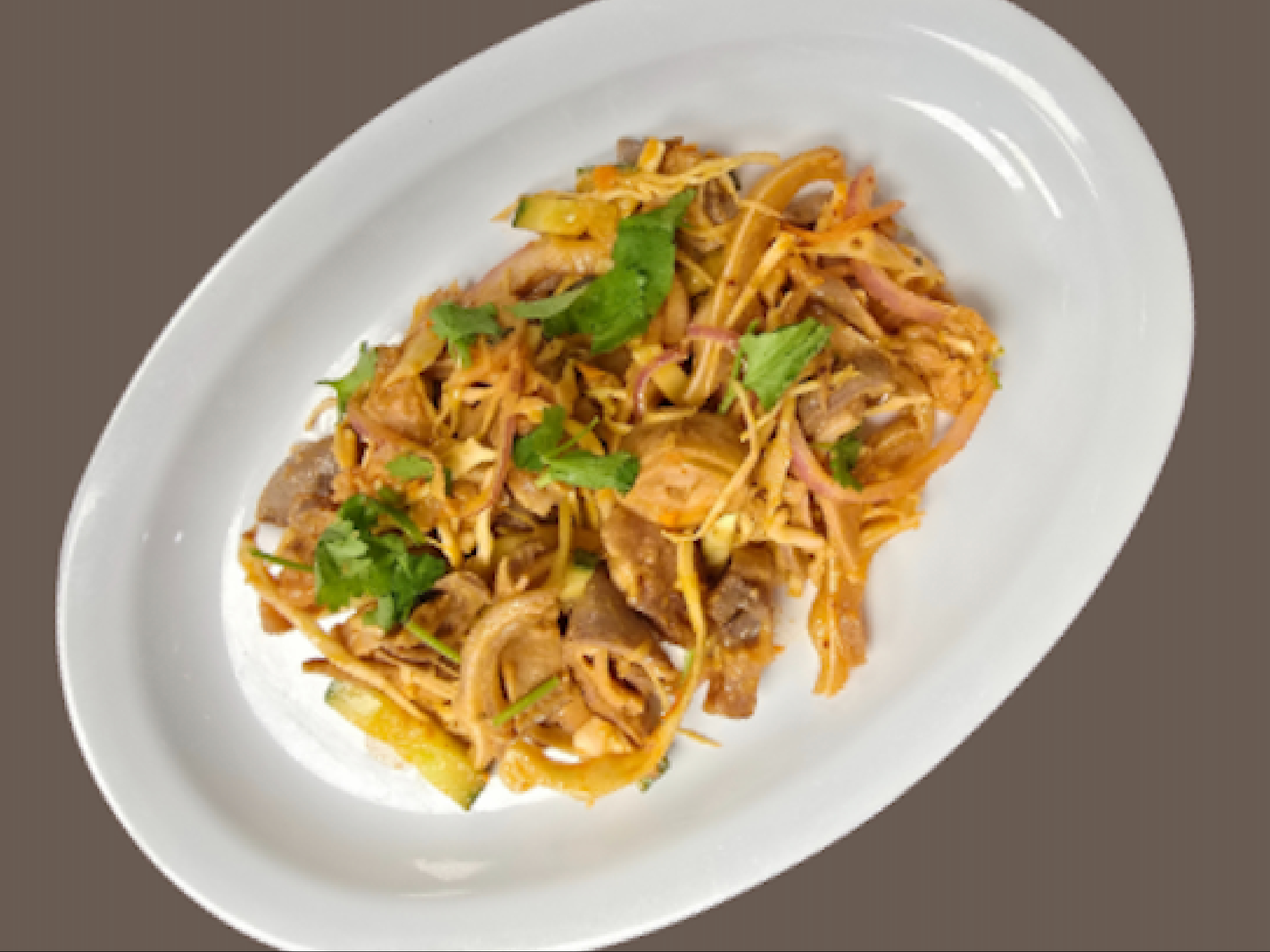 Shredded Green Papaya, Dry Baby Shirmp, Garlic, Green Beans, Tomatoes, Lime Juice, Thai Eggplant, Cabbage, Chili, Fish. Sayce, Peanuts, Rice Noodle